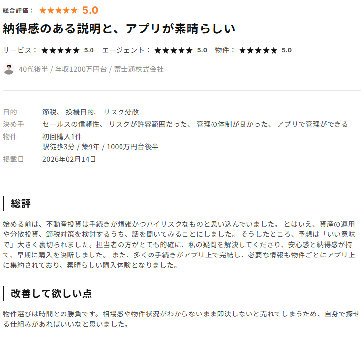 また、基本的にはアプリなどを活用し自分自身で不動産投資を進めていけるということで、あくまで営業担当はサポート役に徹してくれるところが魅力的だと思います。