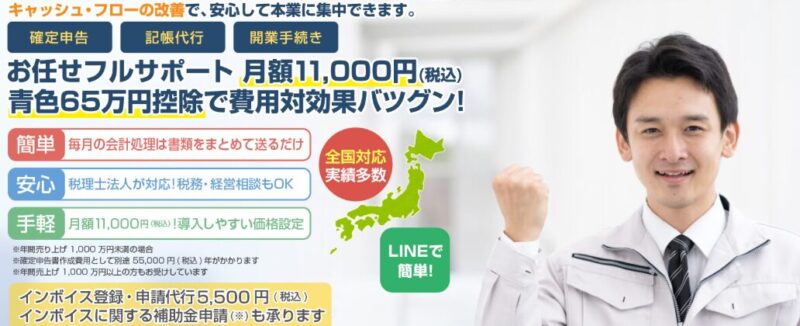| 料金設定(税込) | 顧問料:月11,000円 決算料:年55,000円 ※年商1,000万円未満の場合 |
