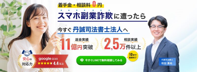 丹誠司法書士法人は、情報商材詐欺、副業詐欺、ネット詐欺など詐欺案件をメインに取り扱っている司法書士事務所です。